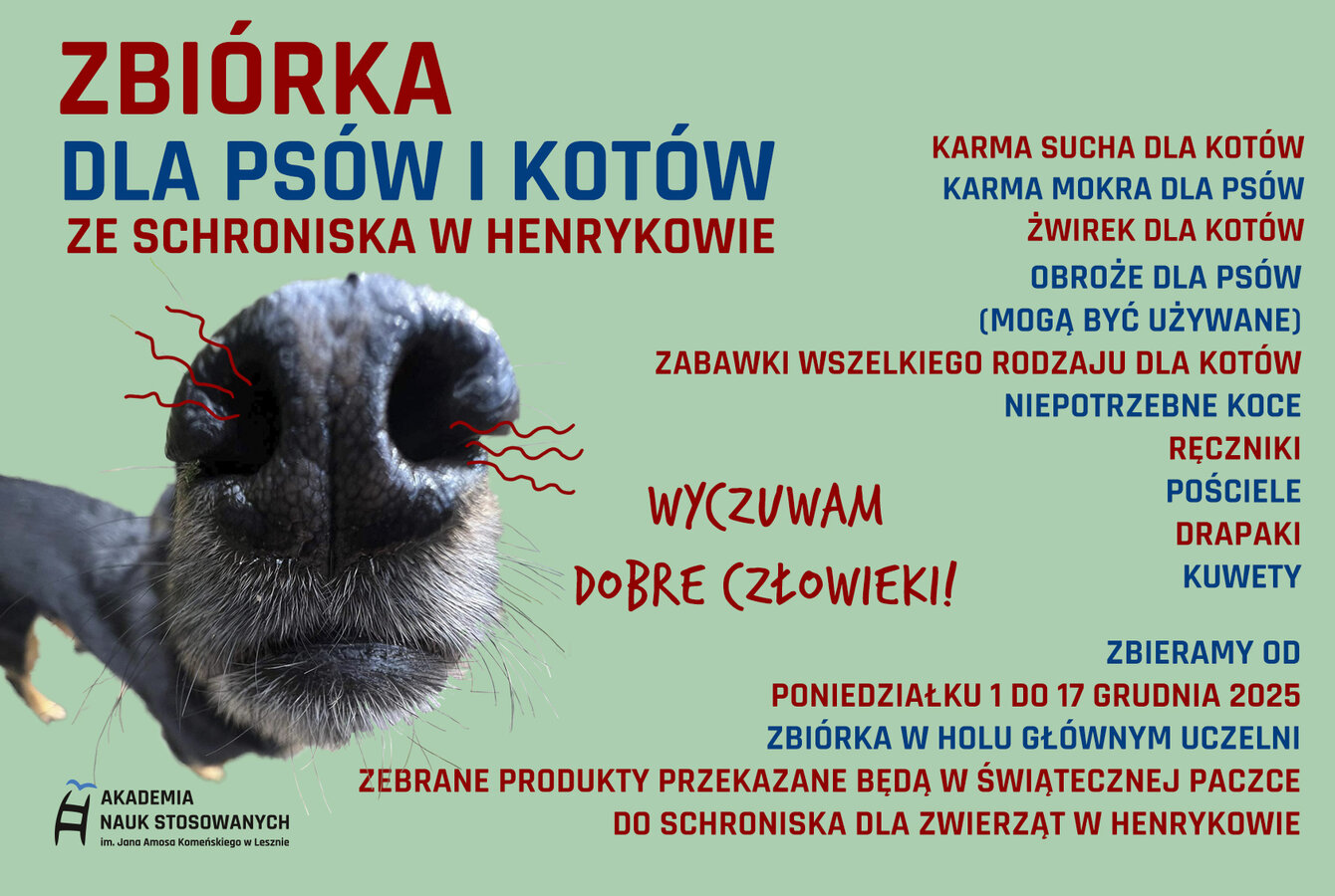 Zbiórka trwa od 1 do 17 grudnia 2025 r. Świąteczne dary prosimy przynosić do holu głównego Uczelni. Zebrane produkty przekazane zostaną w świątecznej paczce do schroniska dla zwierząt w Henrykowie.